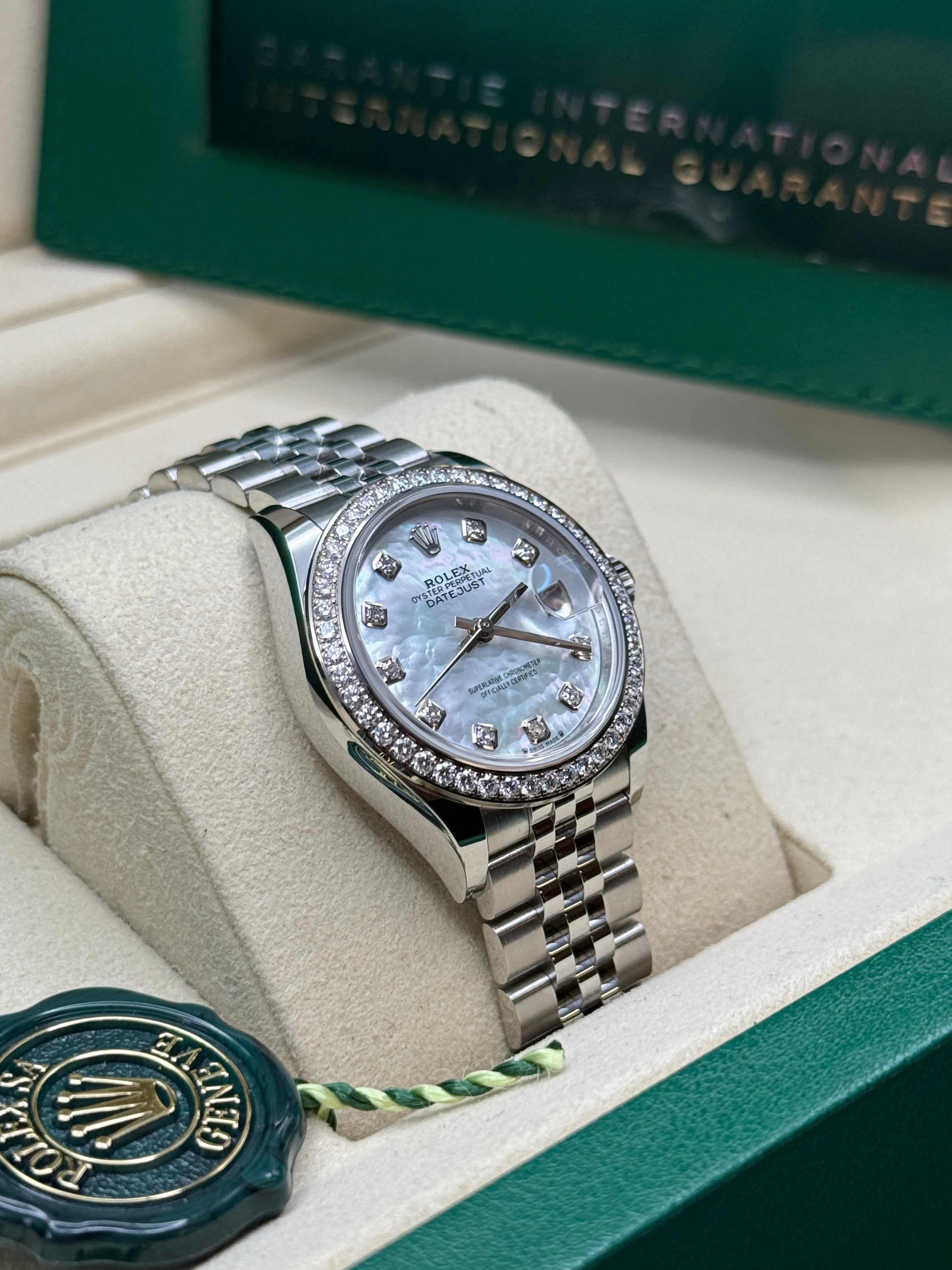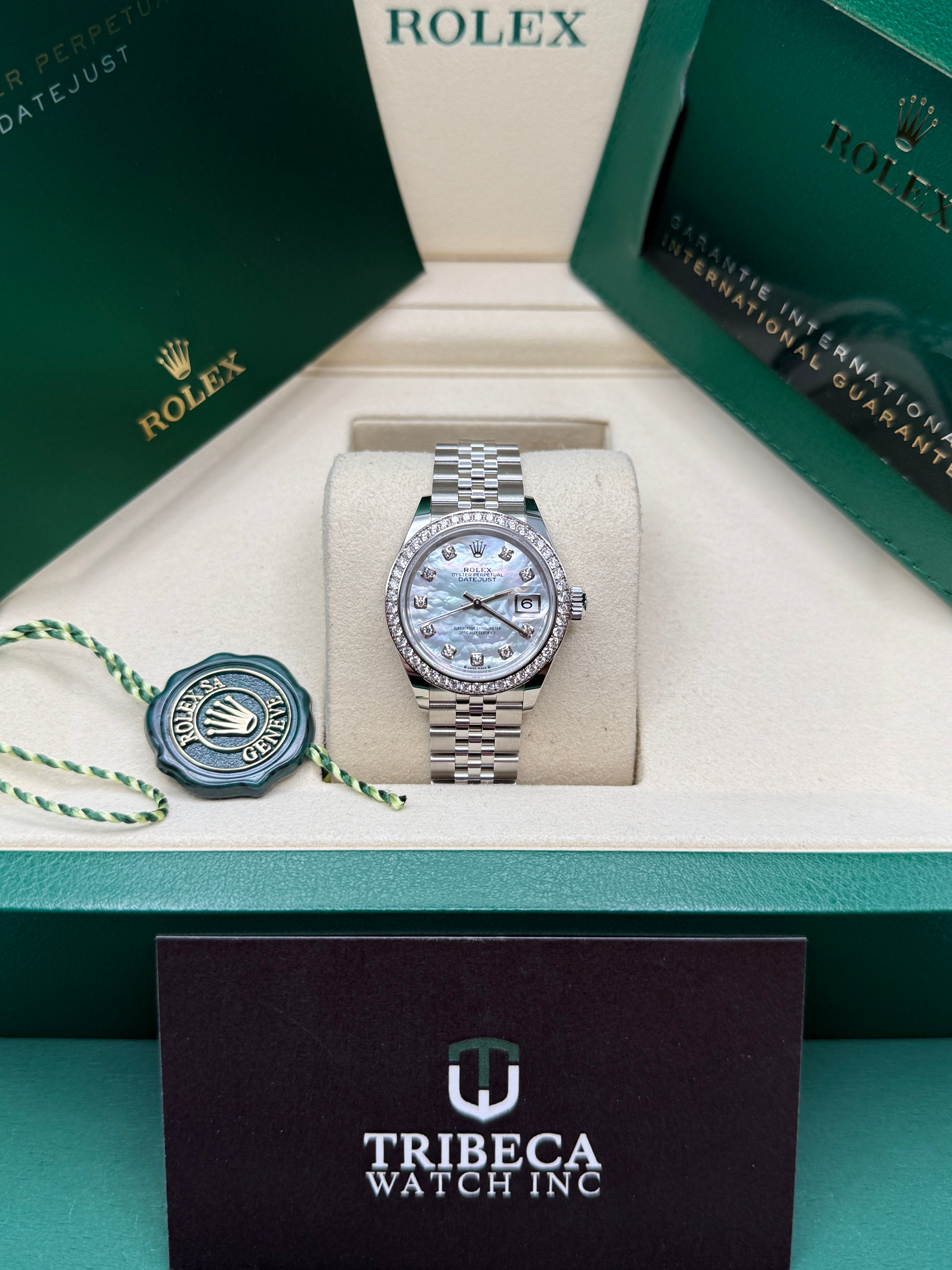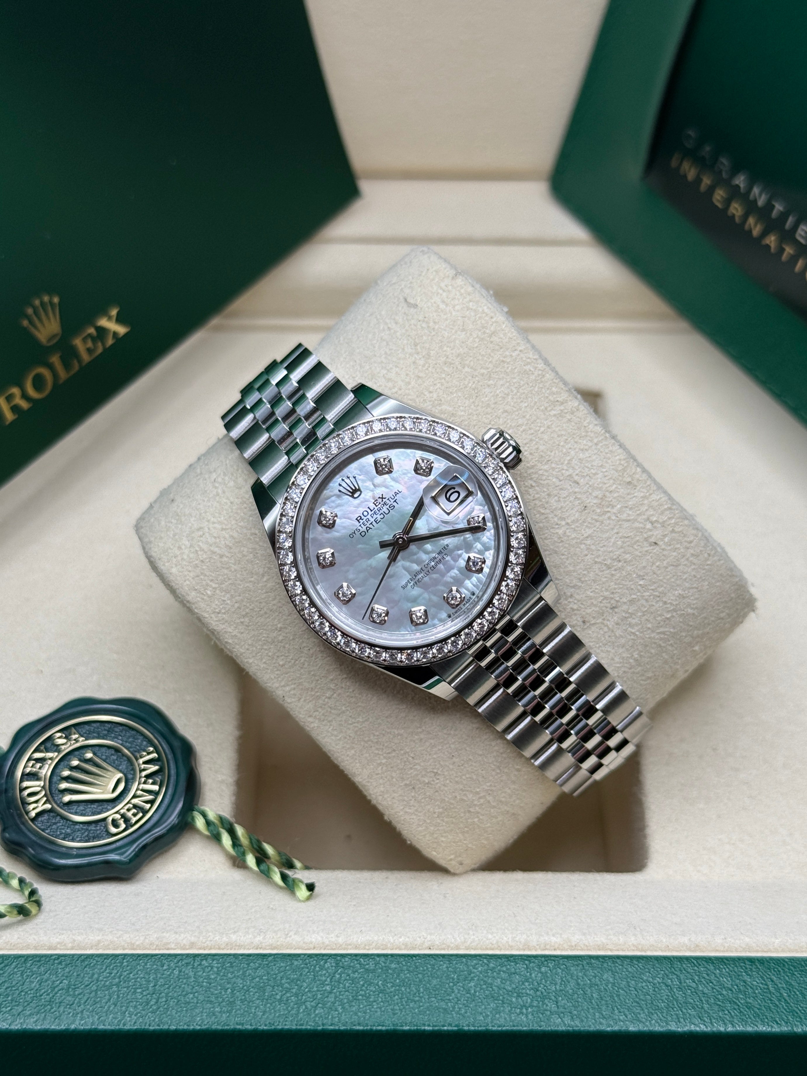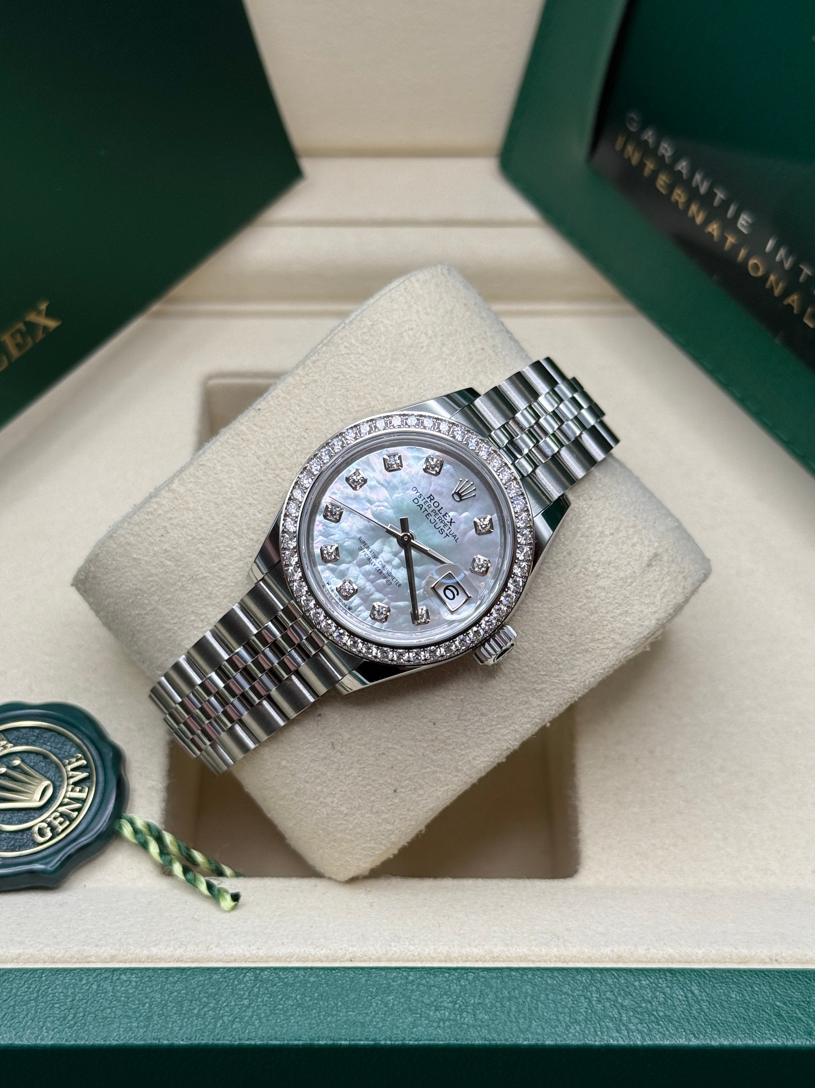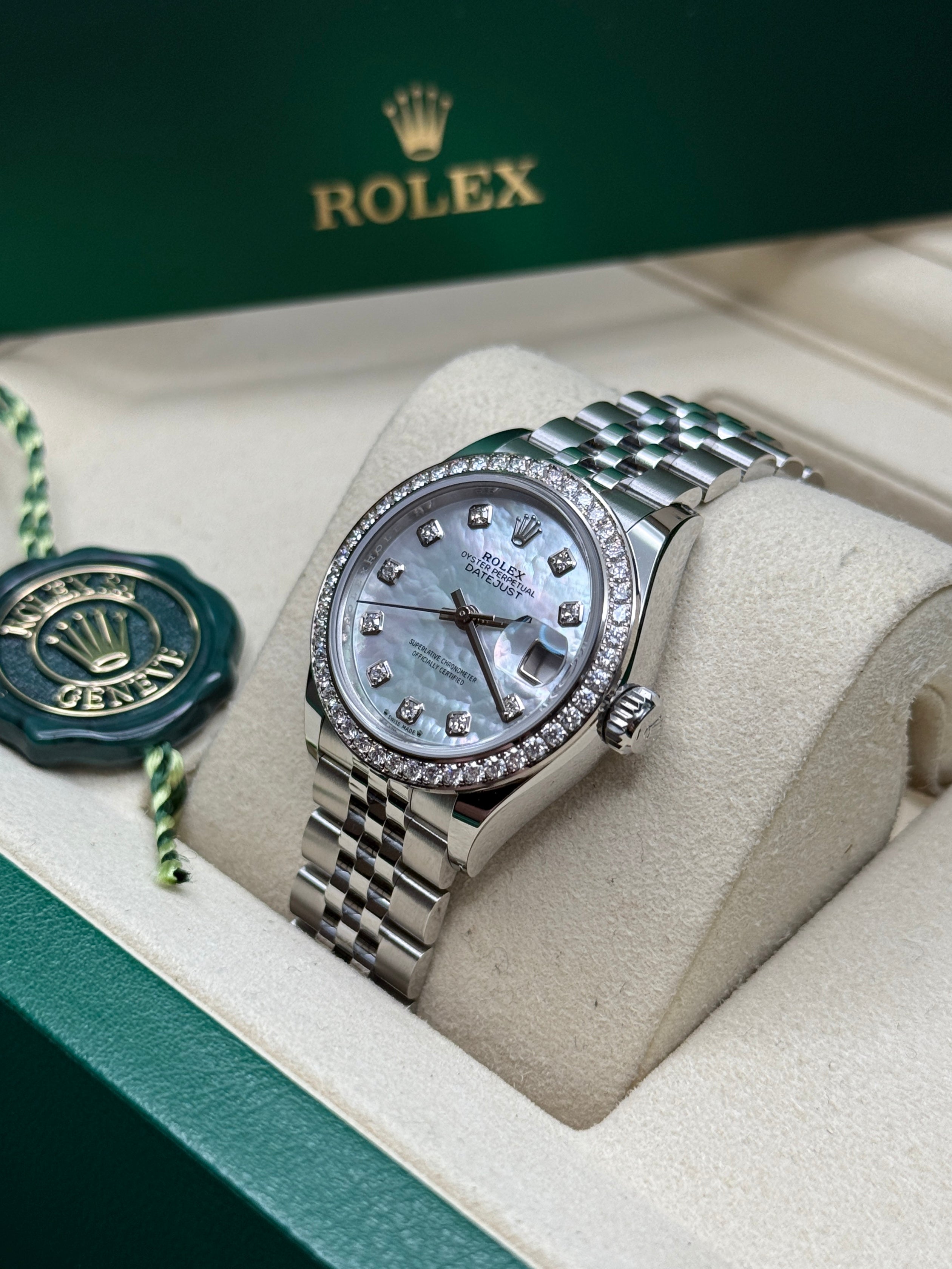The classic Rolex feminine watch, the Lady-Datejust concentrates all the attributes of the Datejust, the brand’s emblematic watch that has been a byword for style and technical performance ever since its launch in 1945. The women’s version of this date chronometer, the Lady-Datejust, which first appeared in 1957, carries the elegance of the Datejust in a small 28 mm size particularly suited to a slender wrist. The Lady-Datejust upholds the hallmark features of the Datejust line, with a self-winding, waterproof Oyster case that is robust yet graceful. Its calibre 2236 movement, crafted entirely by Rolex, ensures precision and performance. The Lady-Datejust is guaranteed waterproof to a depth of 100 meters (330 feet), making it a resilient and elegant choice for any occasion.
