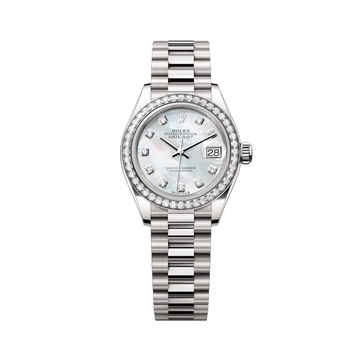 The classic Rolex feminine watch, the Lady-Datejust concentrates all the attributes of the Datejust, the brand’s emblematic watch that has been a byword for style and technical performance ever since its launch in 1945. The women’s version of this date chronometer, the Lady-Datejust, which first appeared in 1957, carries the elegance of the Datejust in a small 28 mm size particularly suited to a slender wrist. The Lady-Datejust upholds the hallmark features of the Datejust line, with a self-winding, waterproof Oyster case that is robust yet graceful. Its calibre 2236 movement, crafted entirely by Rolex, ensures precision and performance. The Lady-Datejust is guaranteed waterproof to a depth of 100 meters (330 feet), making it a resilient and elegant choice for any occasion.