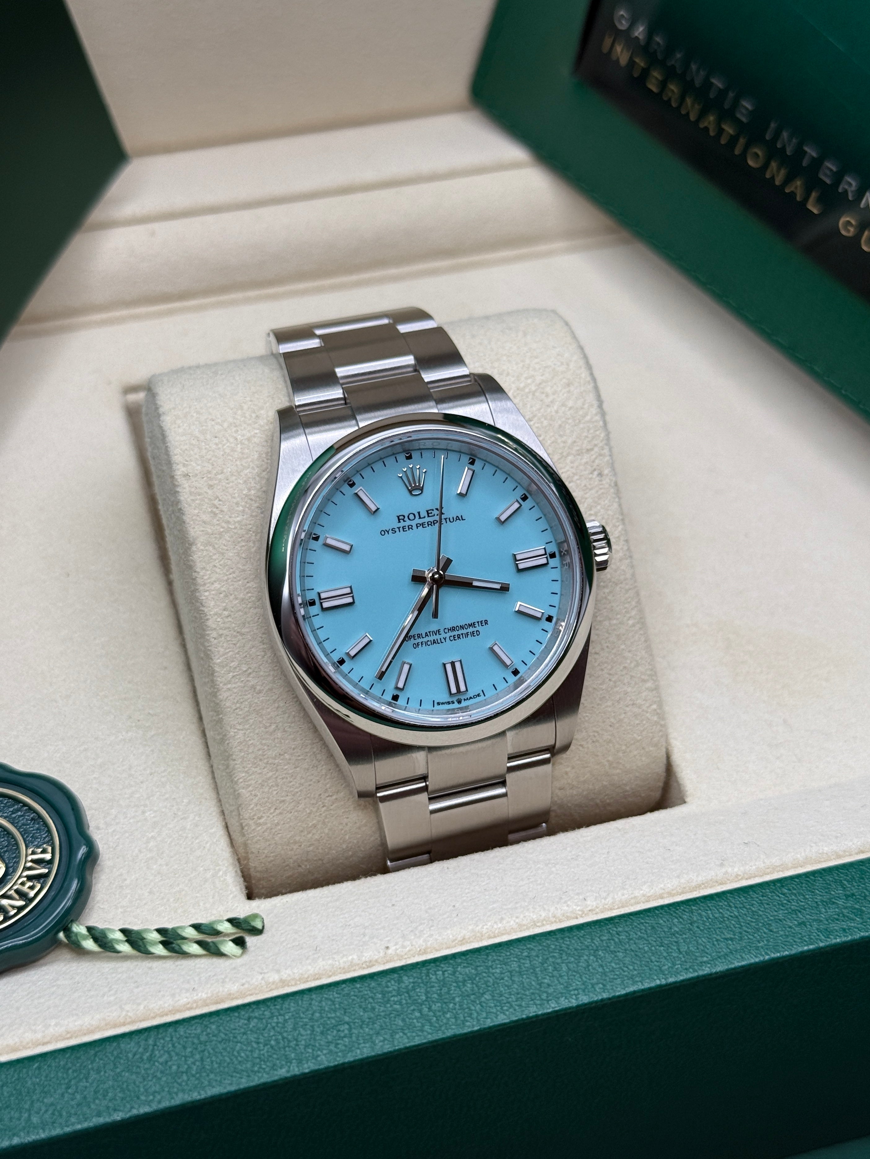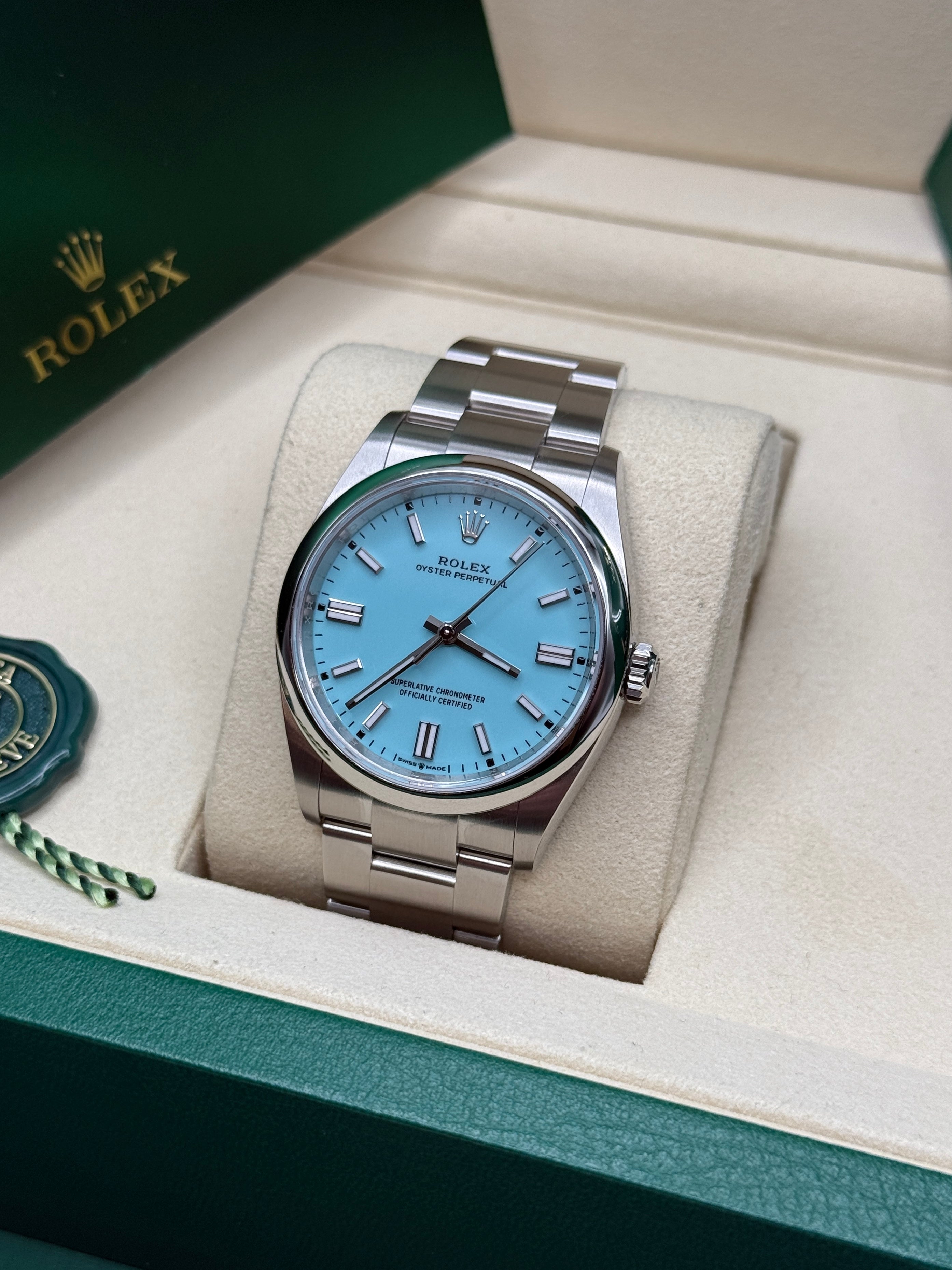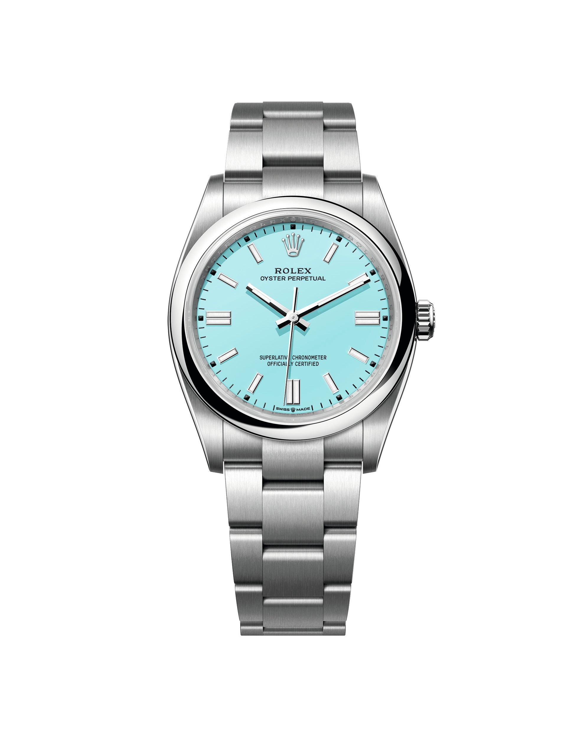 The Oyster Perpetual is the direct descendant of the original Oyster launched in 1926, the first waterproof wristwatch in the world and the foundation on which Rolex has built its reputation. A certified Superlative Chronometer, the Oyster Perpetual features all the key characteristics of the Oyster Perpetual collection – the waterproof Oyster case, a mechanical self-winding movement via Perpetual rotor, and excellent chronometric precision. Understated and elegant, this timepiece is known for its universal, classic style. The Oyster Perpetual’s Oyster case guarantees waterproof to a depth of 100 meters (330 feet), being a paragon of robustness and reliability. The Oyster Perpetual models are equipped with calibre 2232 (Oyster Perpetual 28, Oyster Perpetual 31 and Oyster Perpetual 34), or calibre 3230 (Oyster Perpetual 36 and Oyster Perpetual 41), self-winding mechanical movements entirely developed and manufactured by Rolex.