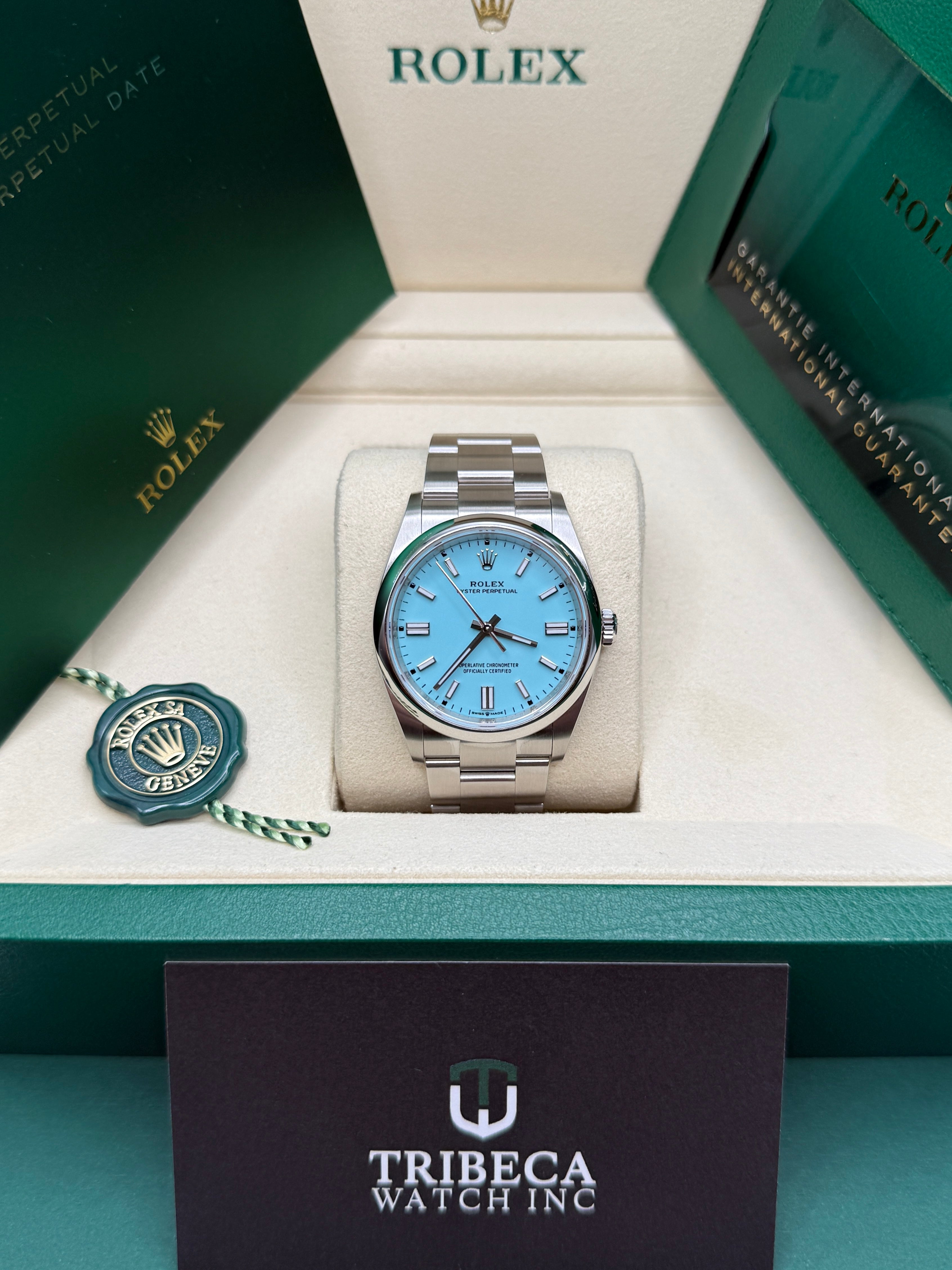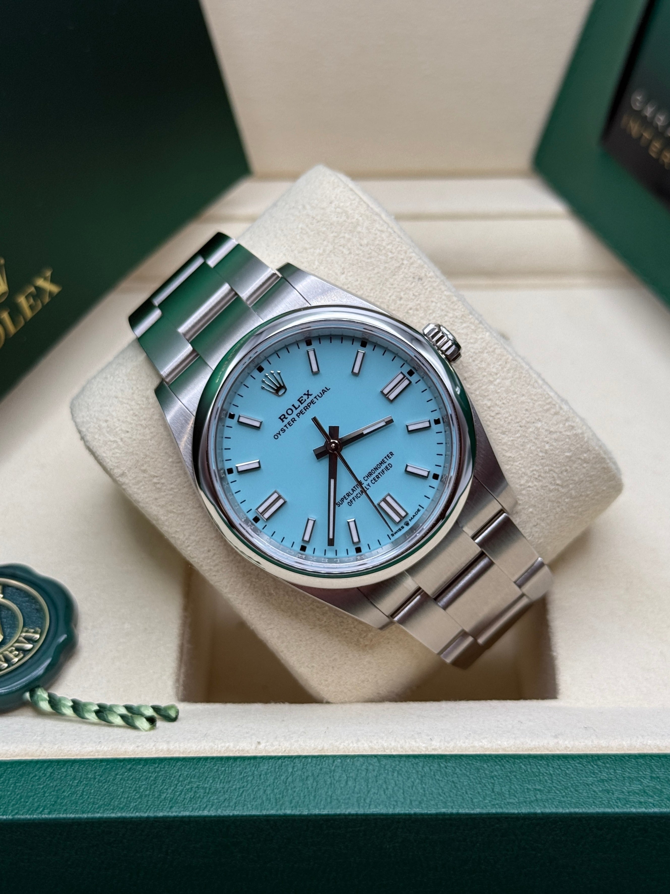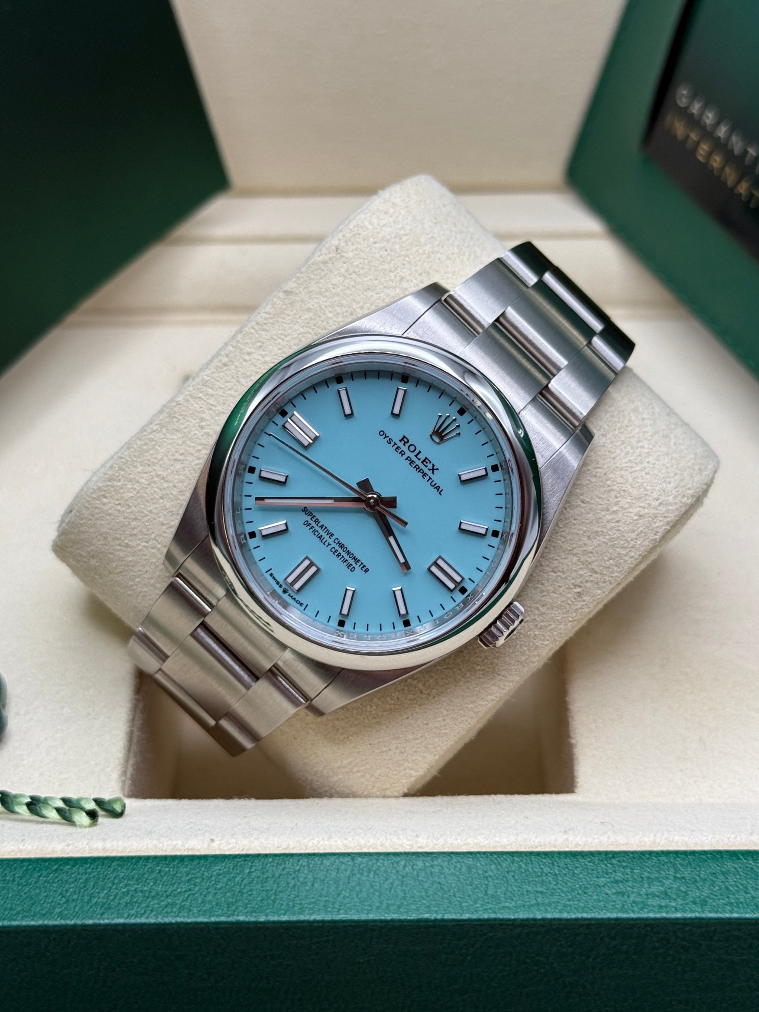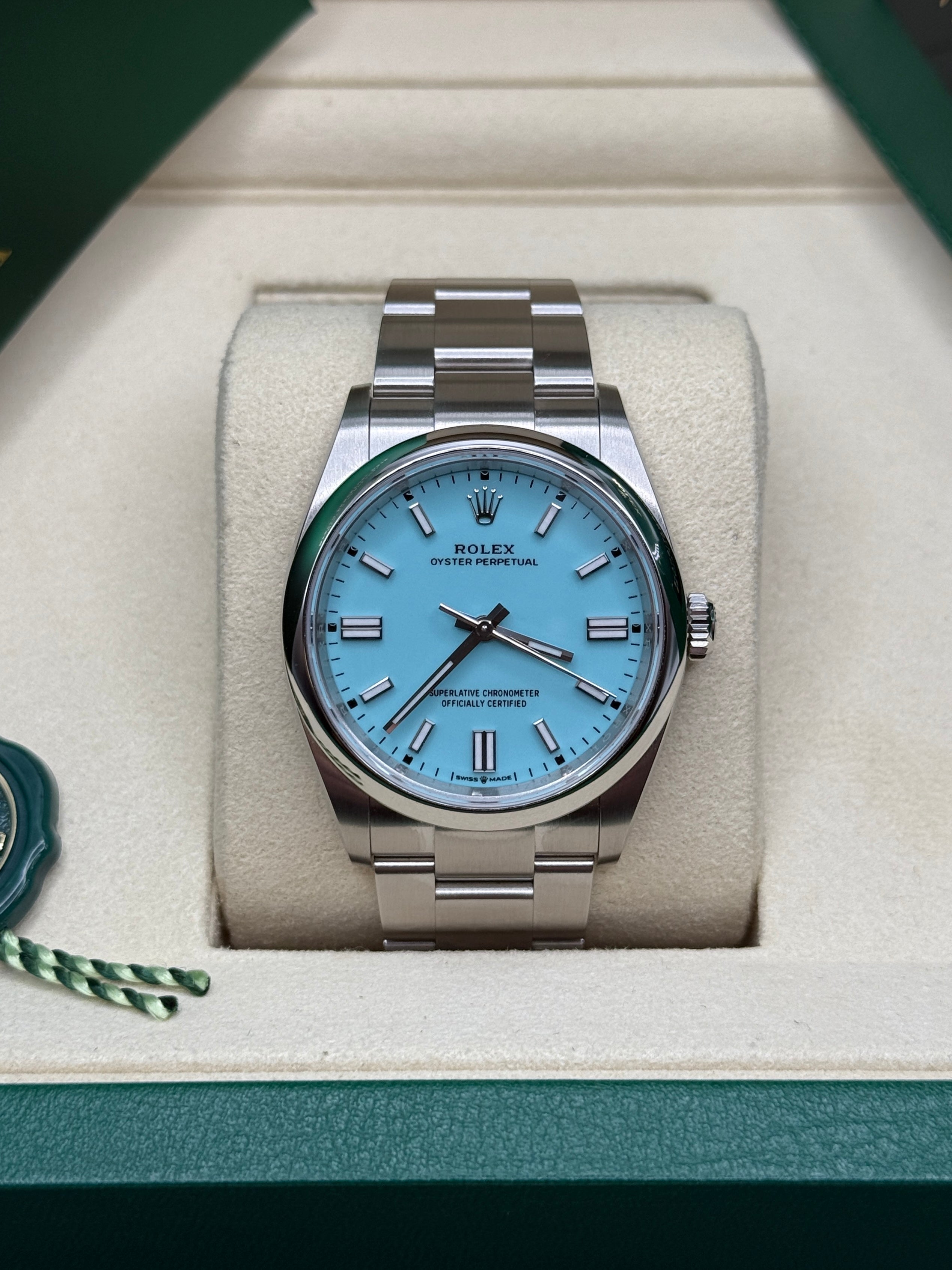 The Oyster Perpetual is the direct descendant of the original Oyster launched in 1926, the first waterproof wristwatch in the world and the foundation on which Rolex has built its reputation. A certified Superlative Chronometer, the Oyster Perpetual features all the key characteristics of the Oyster Perpetual collection – the waterproof Oyster case, a mechanical self-winding movement via Perpetual rotor, and excellent chronometric precision. Understated and elegant, this timepiece is known for its universal, classic style. The Oyster Perpetual’s Oyster case guarantees waterproof to a depth of 100 meters (330 feet), being a paragon of robustness and reliability. The Oyster Perpetual models are equipped with calibre 2232 (Oyster Perpetual 28, Oyster Perpetual 31 and Oyster Perpetual 34), or calibre 3230 (Oyster Perpetual 36 and Oyster Perpetual 41), self-winding mechanical movements entirely developed and manufactured by Rolex.