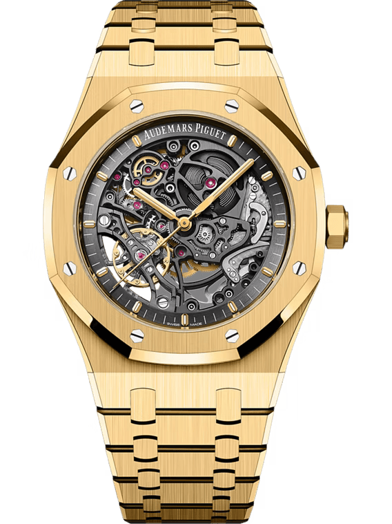 Crafted in precious metal, the Royal Oak is defined by its sharp architectural lines and unmistakable silhouette. The dial, enriched with the signature “tapisserie” pattern, adds depth, texture and sophistication, catching the light with remarkable intensity. Perfectly balanced and exceptionally comfortable on the wrist, the integrated bracelet is finished to the highest standards, reinforcing the watch’s sense of strength and refinement.