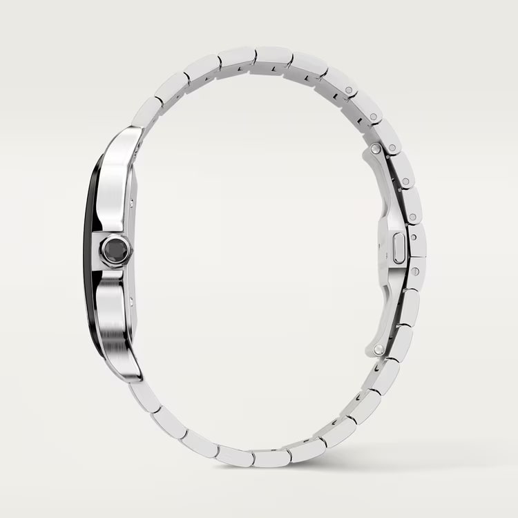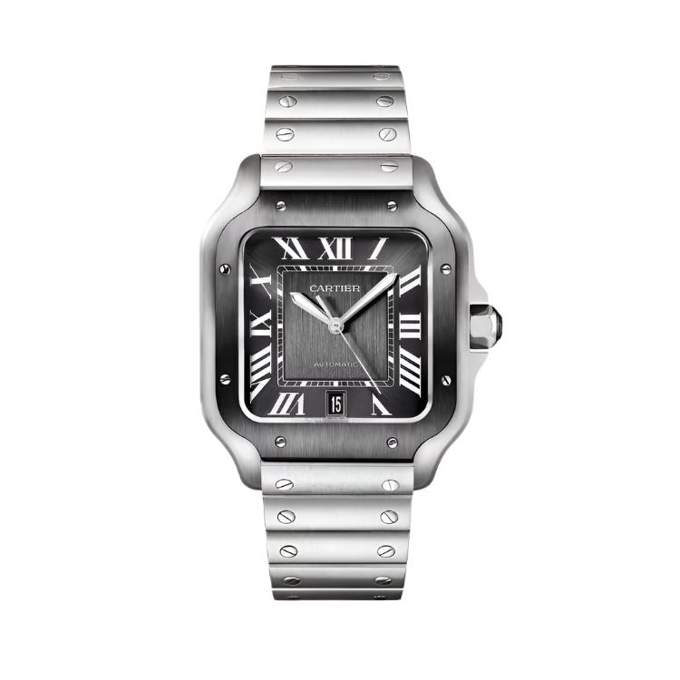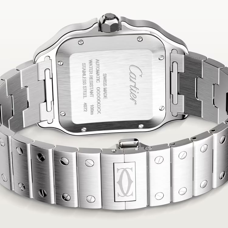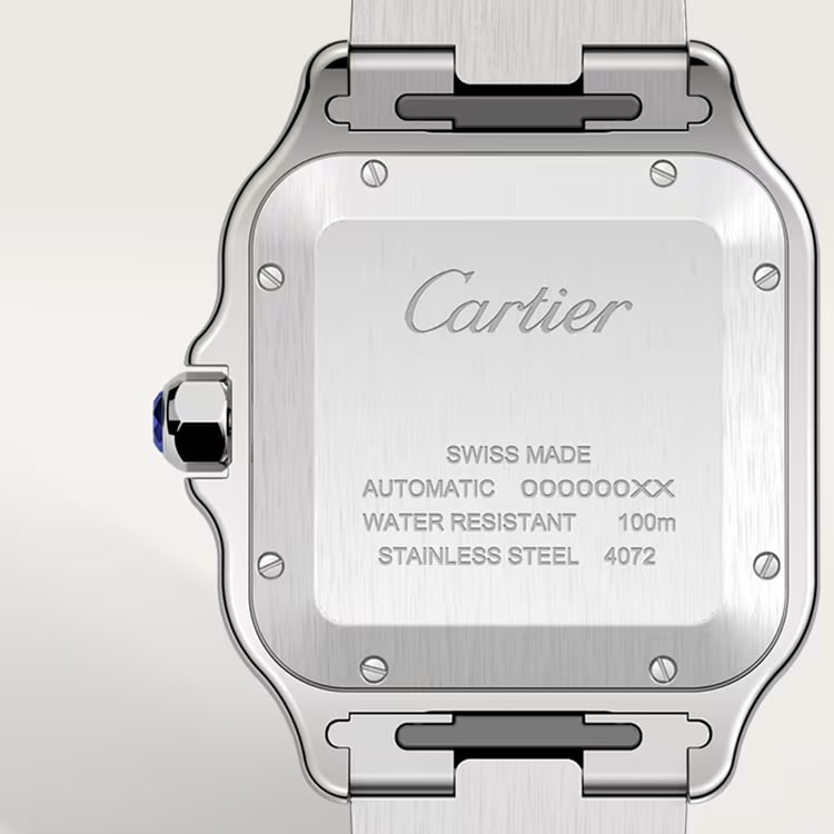 The Santos de Cartier is powered by automatic mechanical movements, ensuring reliable performance. Many models in the collection are water-resistant up to 100 meters, making them suitable for everyday use and light aquatic activities. The watch's aesthetic is completed with the signature exposed screws on the bezel, a hallmark of its industrial charm, and dials that often display Roman numerals with a clean and sophisticated layout.