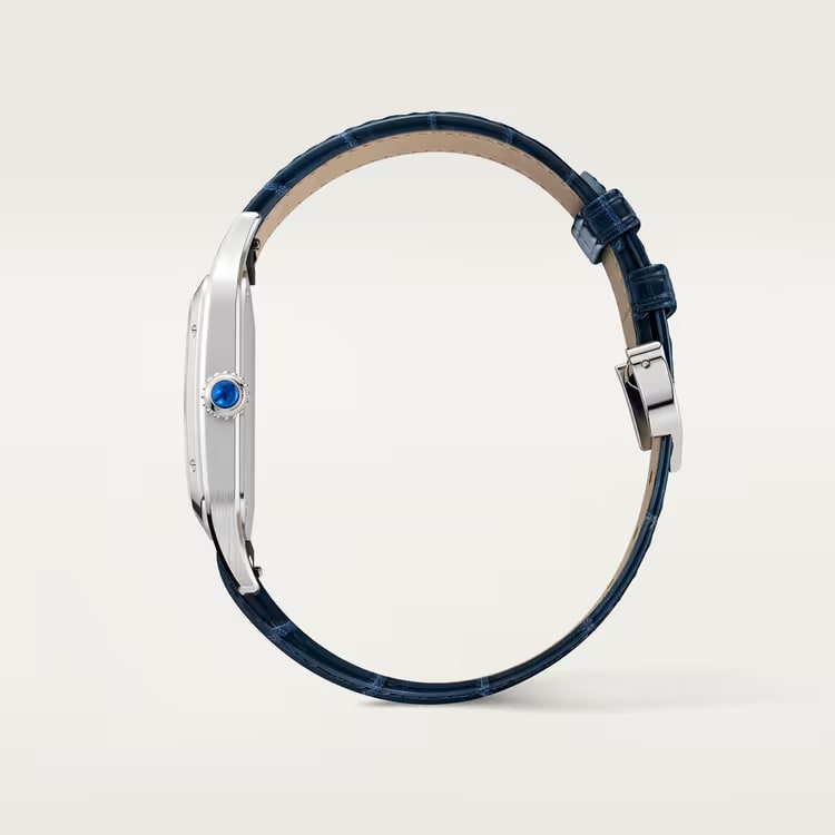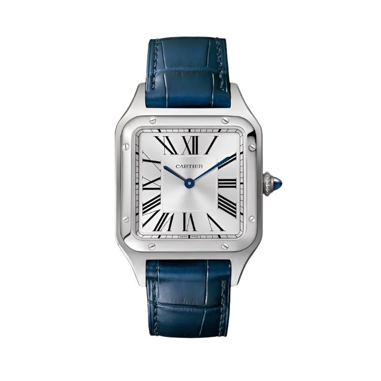 The Santos de Cartier is powered by automatic mechanical movements, ensuring reliable performance. Many models in the collection are water-resistant up to 100 meters, making them suitable for everyday use and light aquatic activities. The watch's aesthetic is completed with the signature exposed screws on the bezel, a hallmark of its industrial charm, and dials that often display Roman numerals with a clean and sophisticated layout.