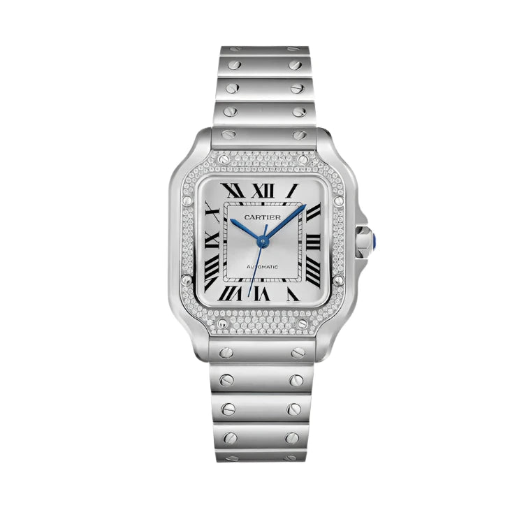 The Santos de Cartier is powered by automatic mechanical movements, ensuring reliable performance. Many models in the collection are water-resistant up to 100 meters, making them suitable for everyday use and light aquatic activities. The watch's aesthetic is completed with the signature exposed screws on the bezel, a hallmark of its industrial charm, and dials that often display Roman numerals with a clean and sophisticated layout.