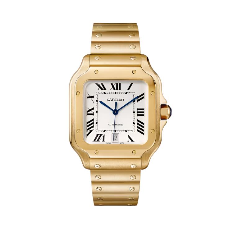 The Santos de Cartier is powered by automatic mechanical movements, ensuring reliable performance. Many models in the collection are water-resistant up to 100 meters, making them suitable for everyday use and light aquatic activities. The watch's aesthetic is completed with the signature exposed screws on the bezel, a hallmark of its industrial charm, and dials that often display Roman numerals with a clean and sophisticated layout.