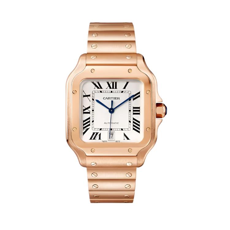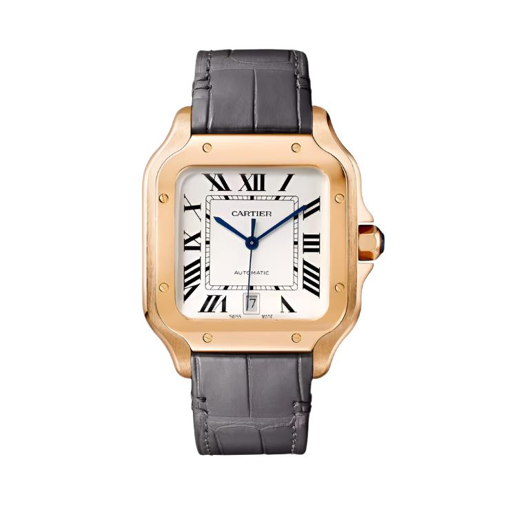 The Santos de Cartier is powered by automatic mechanical movements, ensuring reliable performance. Many models in the collection are water-resistant up to 100 meters, making them suitable for everyday use and light aquatic activities. The watch's aesthetic is completed with the signature exposed screws on the bezel, a hallmark of its industrial charm, and dials that often display Roman numerals with a clean and sophisticated layout.