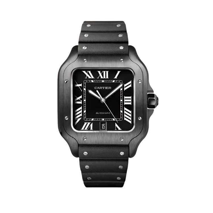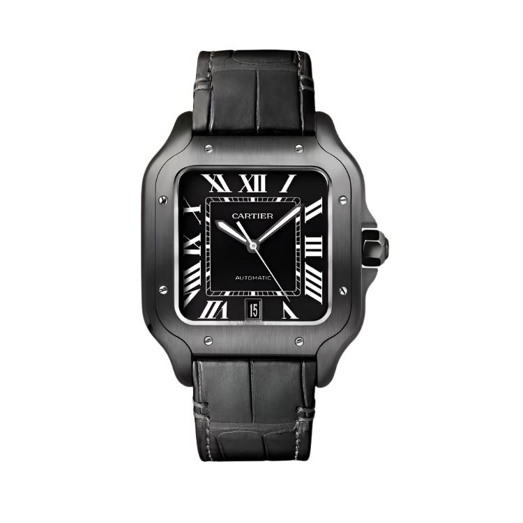 The Santos de Cartier is powered by automatic mechanical movements, ensuring reliable performance. Many models in the collection are water-resistant up to 100 meters, making them suitable for everyday use and light aquatic activities. The watch's aesthetic is completed with the signature exposed screws on the bezel, a hallmark of its industrial charm, and dials that often display Roman numerals with a clean and sophisticated layout.