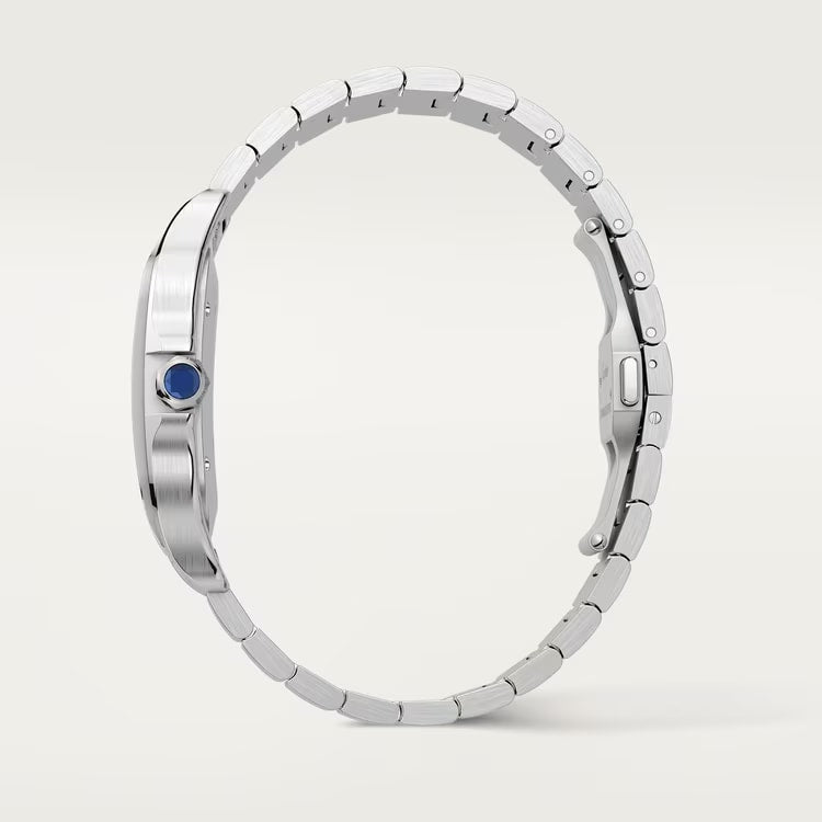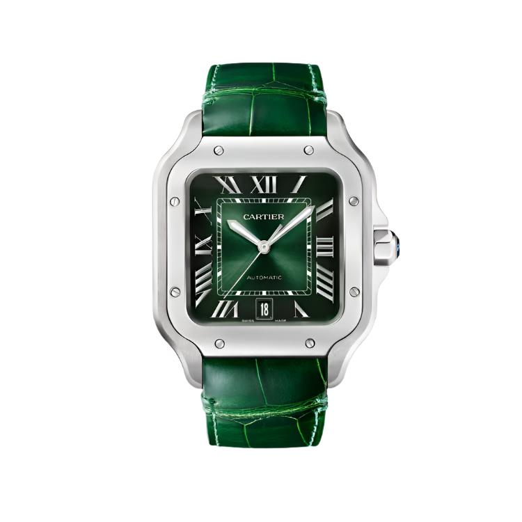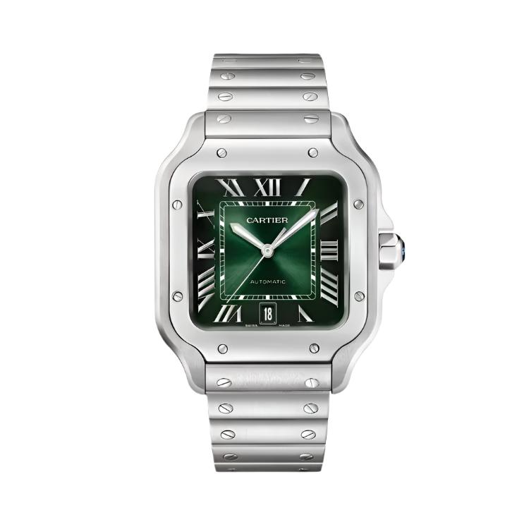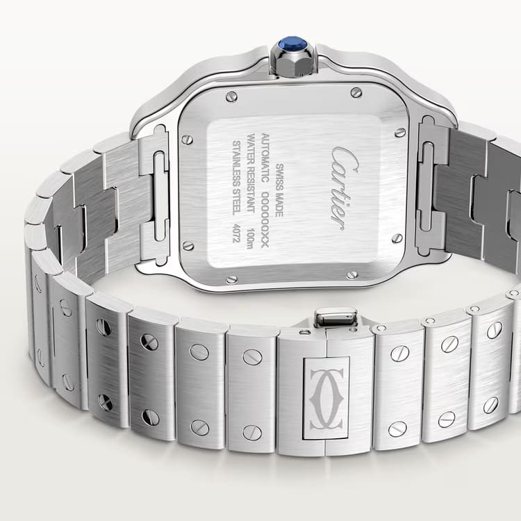 The Santos de Cartier is powered by automatic mechanical movements, ensuring reliable performance. Many models in the collection are water-resistant up to 100 meters, making them suitable for everyday use and light aquatic activities. The watch's aesthetic is completed with the signature exposed screws on the bezel, a hallmark of its industrial charm, and dials that often display Roman numerals with a clean and sophisticated layout.