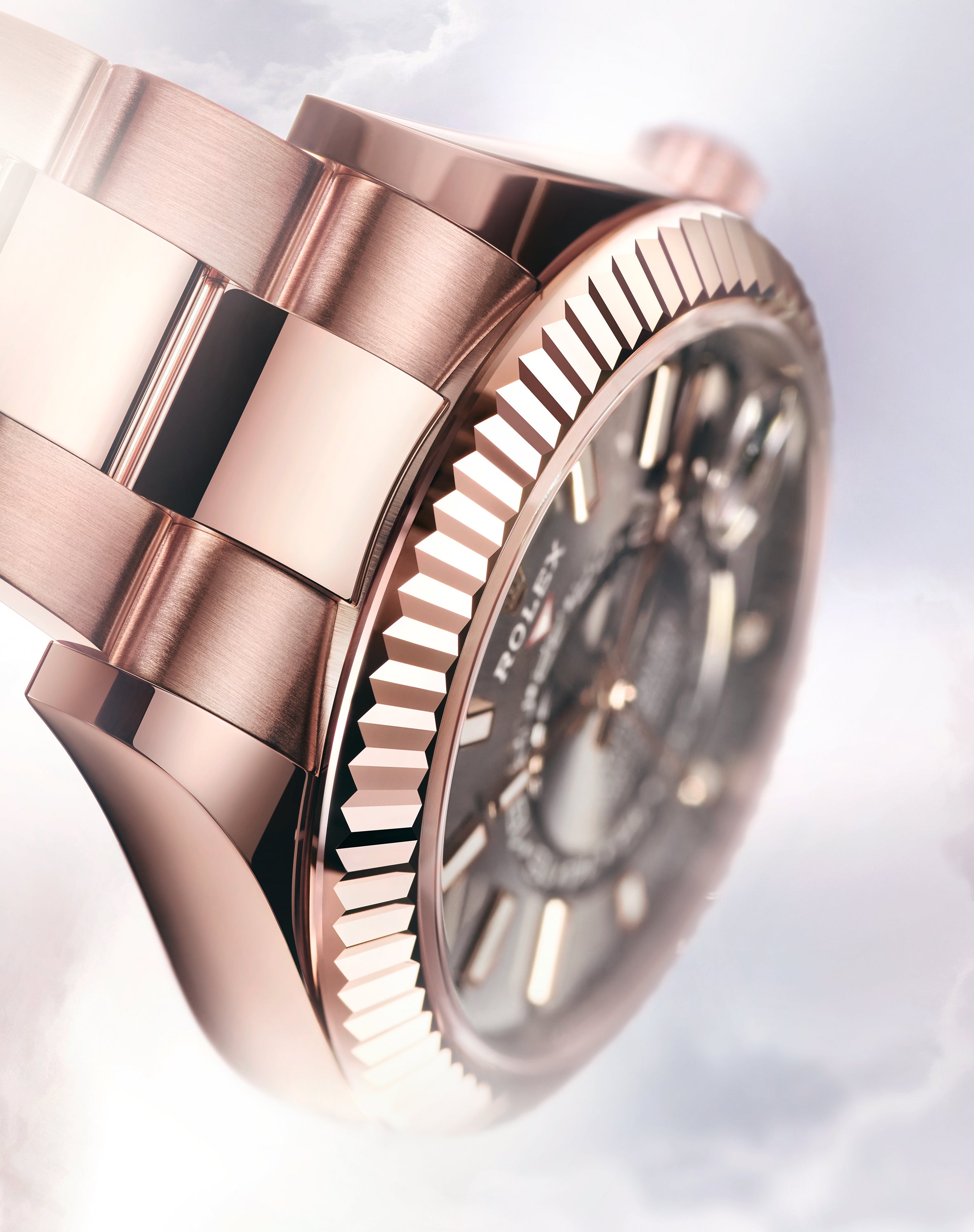 The Sky-Dweller is equipped with a patented mechanism of interaction between the rotatable bezel, winding crown and movement: the Ring Command system, which allows the wearer to select and set the watch's functions one by one, easily, quickly and securely. The Sky-Dweller’s Oyster case, 42 mm in diameter and guaranteed waterproof to a depth of 100 meters (330 feet), is a paragon of robustness and elegance. It is equipped with calibre 9002, a self-winding mechanical movement entirely developed and manufactured by Rolex.Watch