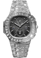 40.5 mm 18K white gold case set with diamonds, sapphire-crystal back, black gradated dial with diamond hour markers, caliber CH 28-520 C FUS self-winding movement Nautilus Travel Time Chronograph (chronograph with 60-minute counter, dual time zone mechanism indicating local and home time, local and home day/night indication in apertures, local date by hand, sweep seconds chronograph hand), approximately 45-55 hours of power reserve, 18K white gold bracelet set with diamonds, butterfly buckle. Water resistant to 120 m.