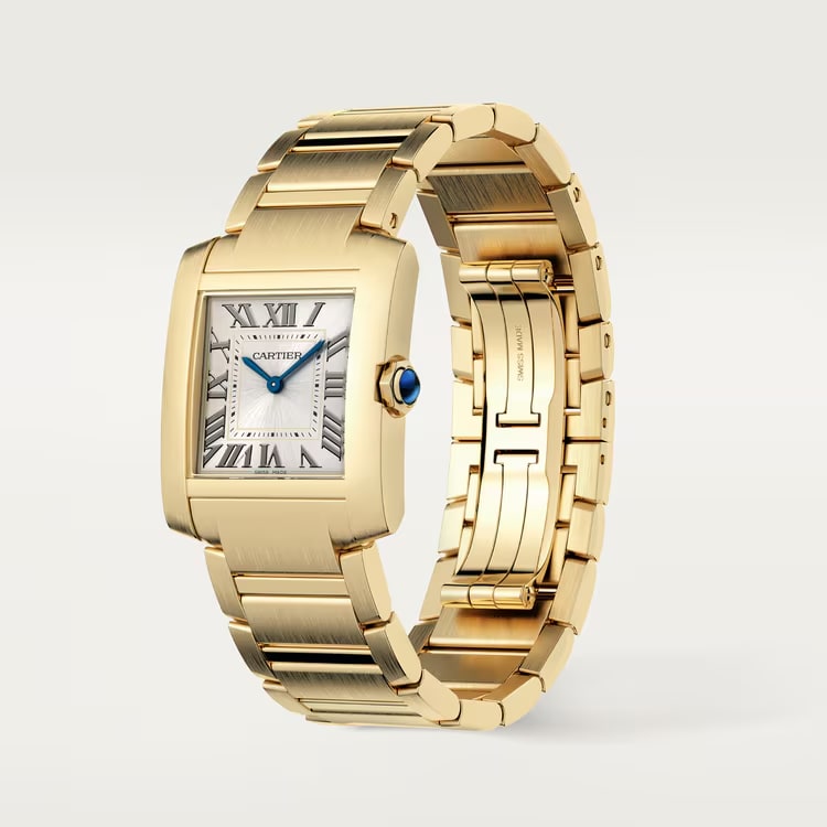 Crafted in stainless steel, gold, or two-tone combinations, the Tank Française offers models with classic dials as well as diamond-set bezels for added luxury. It is water-resistant to 30 meters (100 feet), ensuring durability alongside its refined aesthetics. Whether quartz or automatic, its movements are designed for precision and reliability, reflecting Cartier’s dedication to excellence.