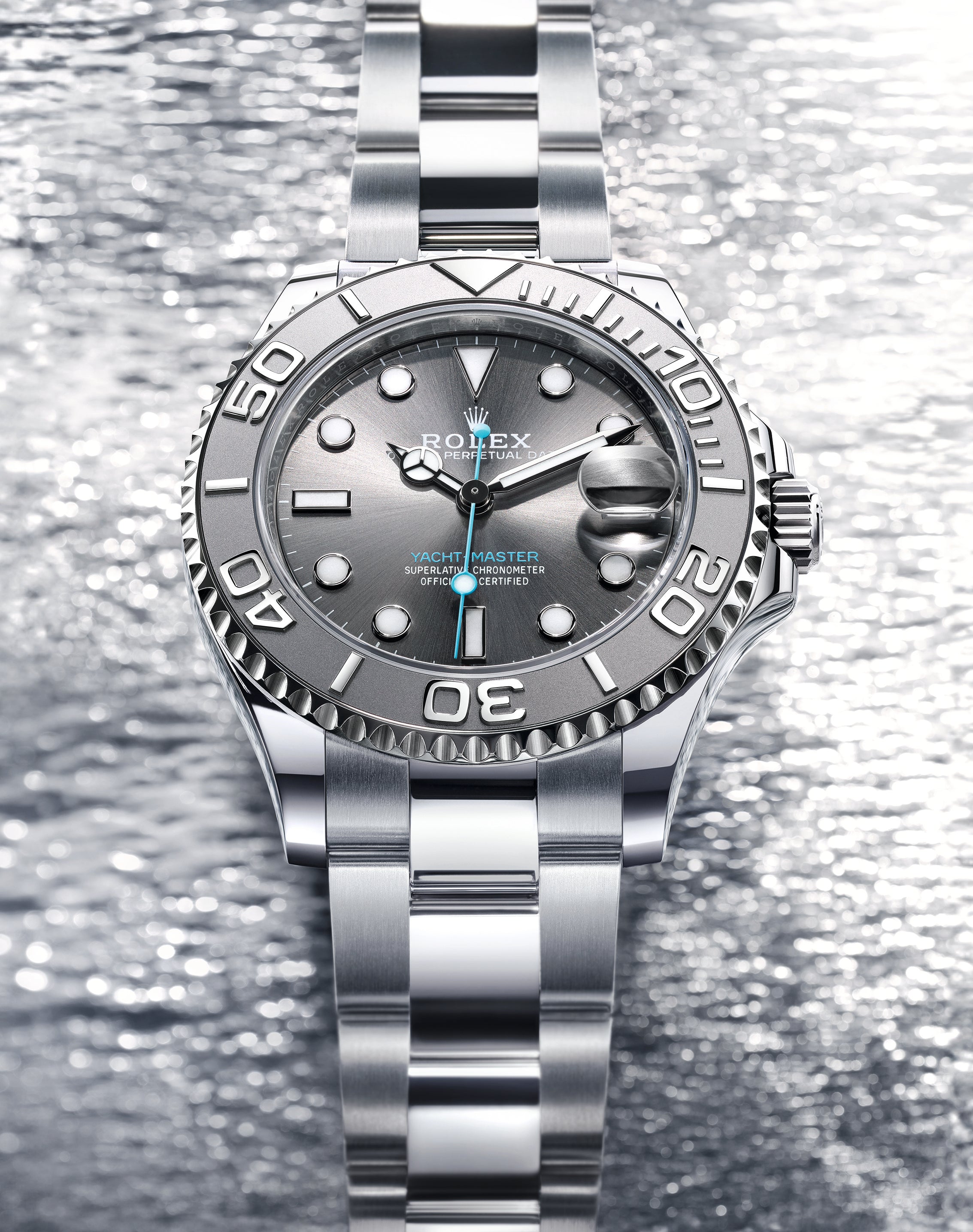 The Yacht-Master offers great legibility in all circumstances, even in the dark, thanks to its Chromalight display: the large hour markers and broad hands are filled or coated with a luminescent material emitting a long-lasting blue glow – for up to two times longer than traditional phosphorescent materials. The Yacht-Master’s Oyster case, 37 mm, 40 mm, or 42 mm in diameter and guaranteed waterproof to a depth of 100 metres (330 feet), is a paragon of robustness and reliability. Its models are equipped with calibre 2236 (Yacht-Master 37) or calibre 3235 (Yacht-Master 40 and Yacht-Master 42), self-winding mechanical movements entirely developed and manufactured by Rolex.