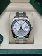 Rolex’s Datejust is the archetype of the classic watch thanks to functions and aesthetics that never go out of fashion. Launched in 1945, it was the first self-winding waterproof chronometer wristwatch to display the date in a window at 3 o’clock on the dial, and consolidated all the major innovations that Rolex had contributed to the modern wristwatch until then. The Datejust has spanned eras while retaining the enduring aesthetic characteristics that make it so instantly recognizable. A paragon of robustness and elegance, the Oyster case of the Datejust 41 is guaranteed waterproof to a depth of 100 meters (330 feet) and is equipped with calibre 3235, a movement entirely developed and manufactured by Rolex.